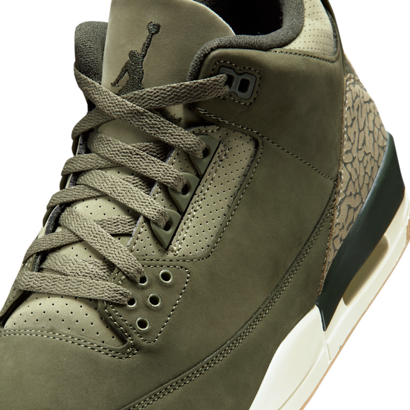 Esta edición de los AJ3 combina a la perfección una parte superior de cuero y nobuk de primera calidad en tonos Oliva medio y Oliva neutro. Para complementar su diseño otoñal, recurre a los detalles en color Secuoya, el revestimiento en estampado tipo piel de elefante, la entresuela en color Vela y una suela exterior en color Café medio goma. El llamativo logotipo de Nike Air en el talón les confiere el aire clásico del modelo original del 88.